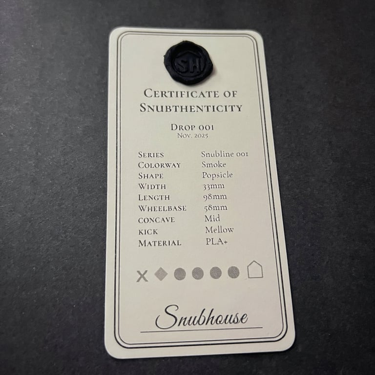 Each deck comes with a signed Certificate of SNUBthenticity, complete with build specs, symbol code, and drop info.
